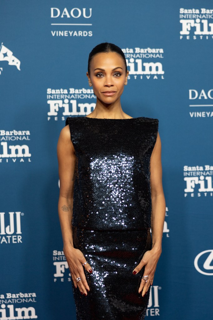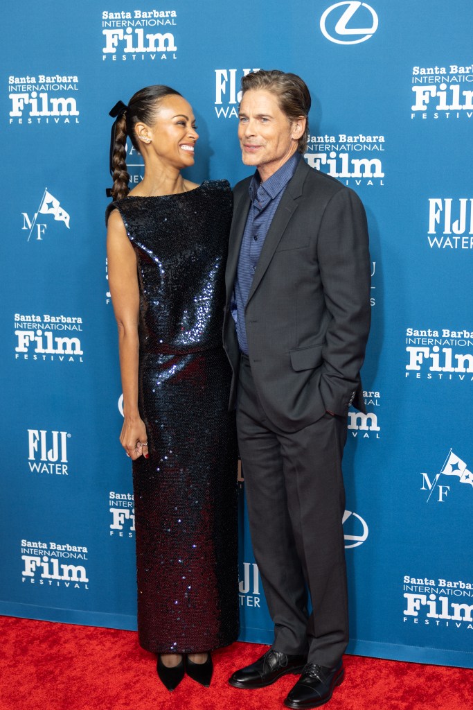 In addition to Saldaña’s Best Supporting Actress nomination, the film is up for a total of 13 Academy Awards, including Best Picture. And along with her Critics Choice and Golden Globe Awards, the Montecito resident added another trophy to her mantle as the recipient of Santa Barbara International Film Festival American Riviera Award earlier this week. It was quite a celebration for the hometown crowd. Her three adorable sons — twins Cy and Bowie, 10, and Zen, 8 — accompanied her on the red carpet at the Arlington Theatre, along with her sister and other family members. Rob Lowe, another famous Montecito resident, was also on hand to present the award to his friend and neighbor.
