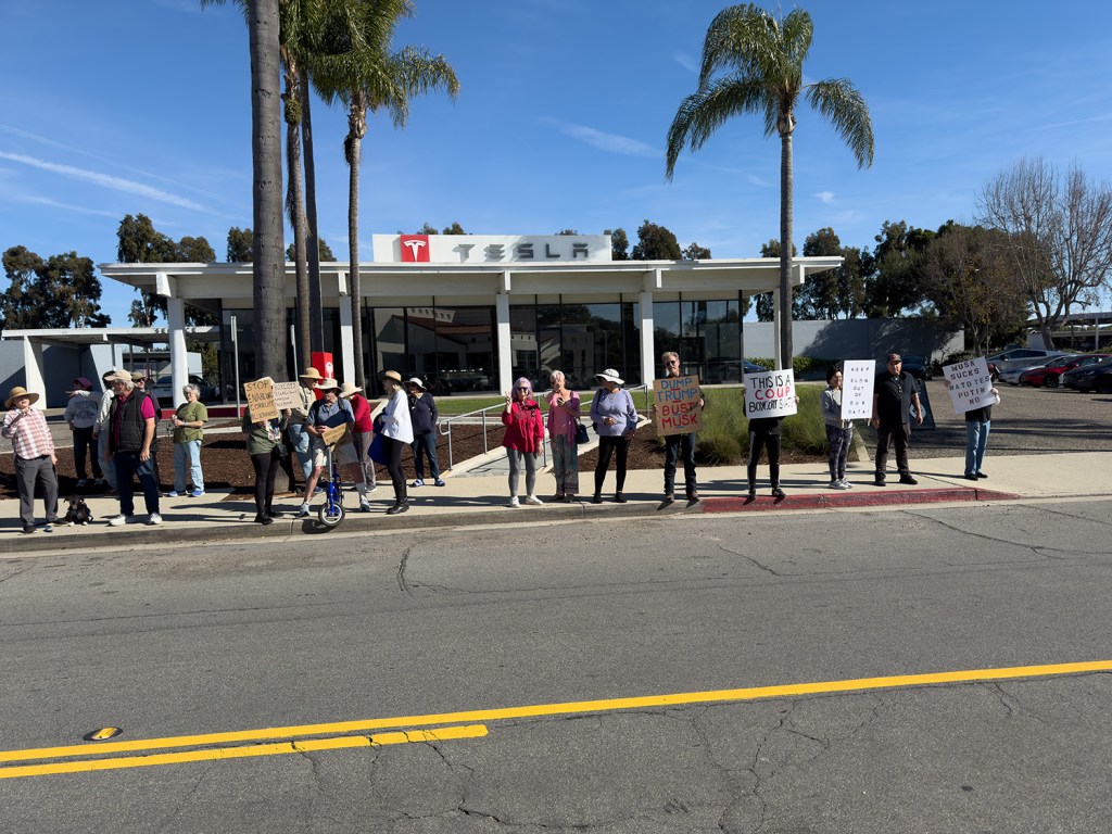 Anti-Musk protesters gathered in front of Tesla’s Santa Barbara showroom on Hitchcock Way on Saturday, February 15. | Credit: Courtesy