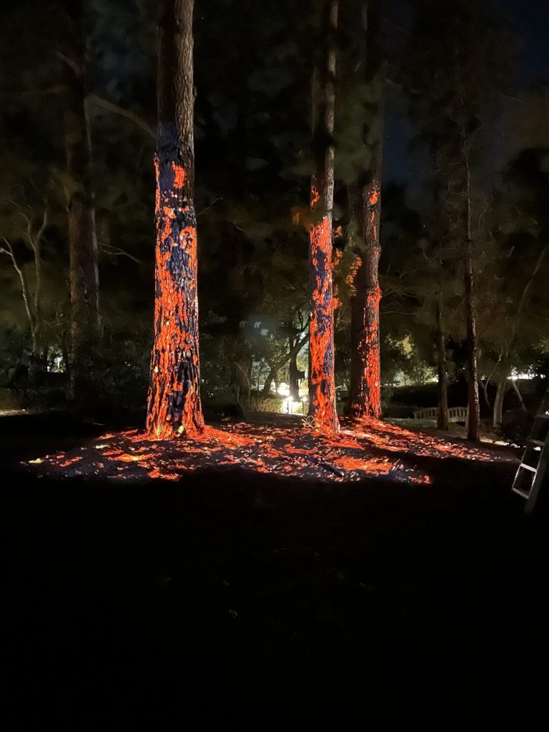 At the event, just after nightfall in a small grove of pine trees on campus, Turpin explained, “The reason we do this is to gain a healthy respect for a natural process. By making art associations, it presents with both the beauty and risk of fire. I think it’s safe to say that fire is beautiful.”
