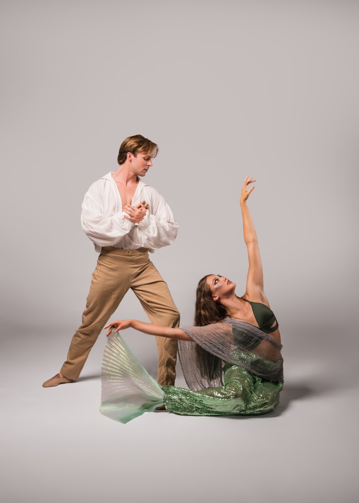 The Sea Witch of the original story, who gives the Little Mermaid the magic with which to ascend to land, is a Siren in SSB’s ballet. “Sorcha” the Siren is exquisitely danced by Arianna Hartanov, accompanied by a huge clamshell puppet manipulated by Amber Hirschfield.