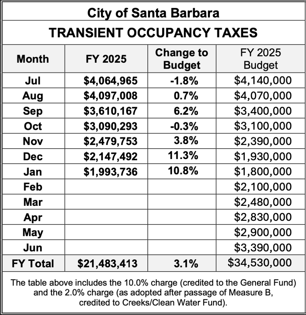 The City of Santa Barbara collected $2.0 Million in Transient Occupancy Taxes (TOT) for January 2025, the seventh month in the City’s fiscal year.