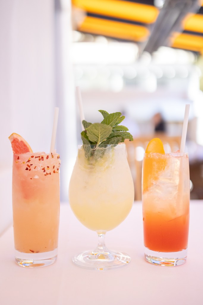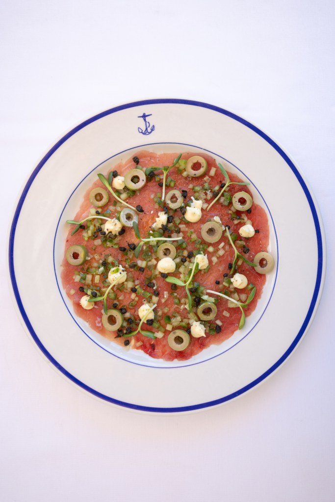 That friendly vibe is enhanced by the bright design, which was spearheaded by Santa Barbara legend Jeff Shelton. His famously whimsical style is a bit more subdued at Clark’s, which leans into soft blue, stark white, and vibrant yellow hues that recall the Greek isles. The energy inside — from the front row stools at the bar and umbrella-shaded patio seats to the cozy booths that afford glimpses of the bustling kitchen — fuels that this-must-be-the-place buzz you catch when walking in.