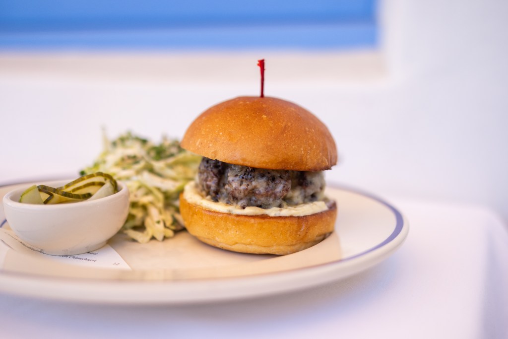 During my first visit, with two restaurateurs and a winemaker, we took over a corner near the bar, ordered cocktails (pink peppercorn paloma for me), and then ran through much of the menu: a piquant caper-enhanced crudo of three different fish; that Crab Louie, with an addictively creamy dressing and generous hunks of claw; crisped-up sea bass atop a sofrito-spiked mound of grits; and then, somehow, a happy hour burger slaked in sauce gribiche and Gruyère, served with excellently thin hand-cut fries.
