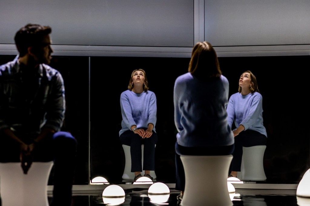 The Rubicon’s production of Constellations is a theatrical experience designed to insist on investment of imagination from the audience. Tom Ainsley (as Roland) and Kodi Jackman (as Marianne) provide anchors in realism within a set by François-Pierre Couture that reminds of a vintage-futurism mirror chamber of glowing orbs and groovy colors. The abstract space accomplishes timeless, placeless, and liminal, and is modest enough to allow the audience to imagine their own necessary details.