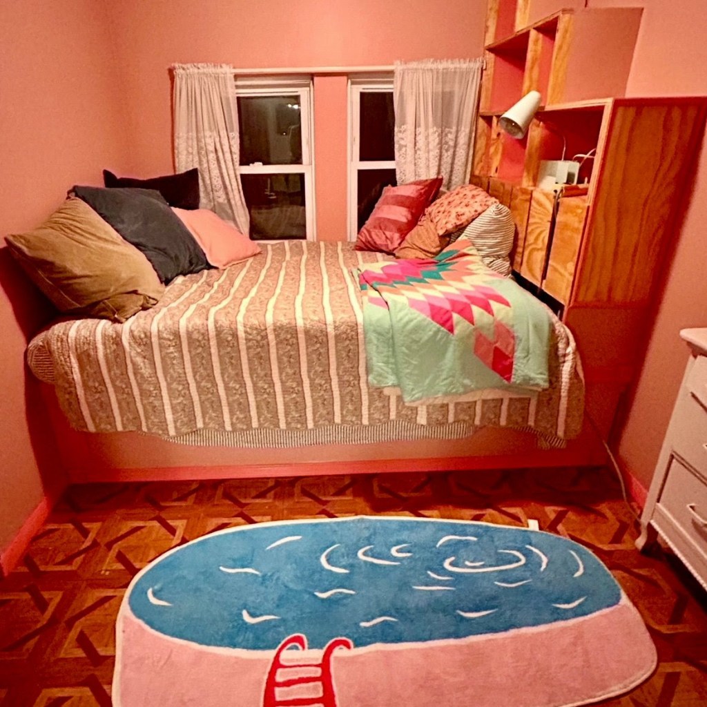 Speaking of bedrooms, I was in Chicago this week visiting my son and daughter-in-law who just had a baby. Yep, I’m a grandmother! I can’t share a photo of my baby granddaughter — a k a the most perfect baby in the world — but here’s a photo of the adorable “grammy flat” that my son built for me upstairs in their bungalow. Funny enough, his design choices echo several of the ideas from the AD article above. Built-in bookshelves that double as a nightstand, colorful accent rug, plentiful throw pillows, and working with the architectural elements of the room. I love it and plan to spend as many nights there as I can. Sweet dreams guaranteed.