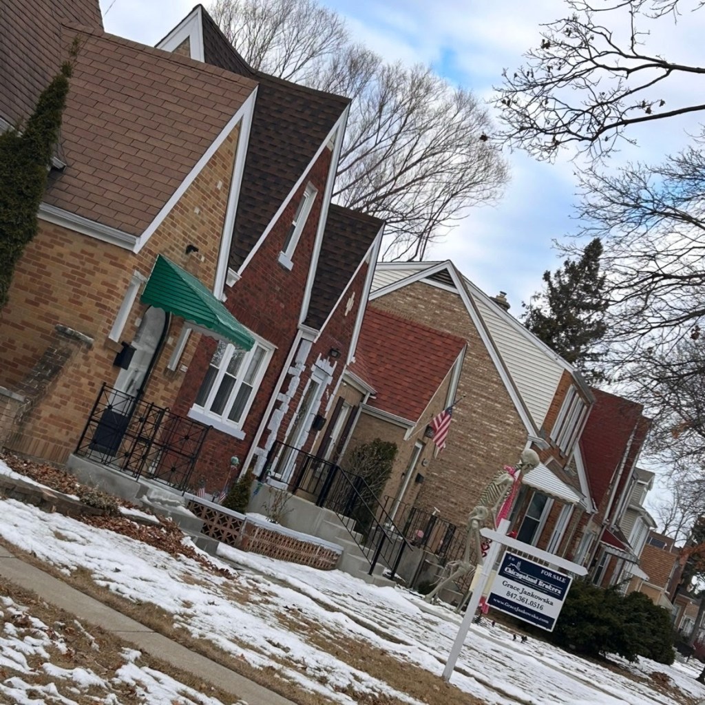 And yes, I did do a little real estate-peeping while I was there. Just looking! The bungalows in their neighborhood — Montclare, which is on the ‘near Westside’ — really vary in price, depending on size, condition, and exact location. The house shown above is listed for $479,900. Yes, there is snow on the ground. But look: there’s also blue sky!