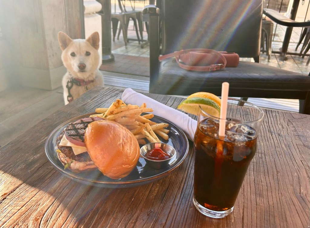 I got home just in time to help put together our upcoming Burger Week issue. Yes, it’s that mouthwatering, finger-licking, moist & meaty time of the year again, starting this Thursday, March 6th. We have a record-breaking thirty-four restaurants participating this year, including a whole slew of first time destinations. I had the pleasure of taste-testing two awesome burgers, but I’m not going to tell you where I dined. Yet. You’ll have to wait til Thursday. But don’t delay! With thirty-four burgers, you’re going to need a plan of attack. Scout got to participate by reviewing the pet-friendliness of our local dining scene. Both locations passed the test, as you can see here. And so did Scout, whose manners were only surpassed by her zeal for beef. She had to make do with milk bones, which worked for everyone.