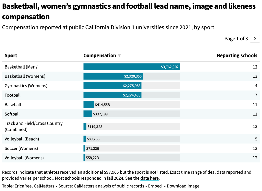 • Except for a few star players, such as Chiles, most female college athletes made very little, according to the data provided to CalMatters.