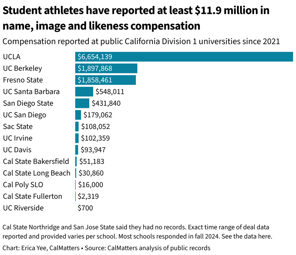 - Collectively, athletes at UCLA and UC Berkeley earned more than double what those attending other UC and California State University campuses made. Some donors, such as those supporting Sacramento State and UC San Diego, have rapidly raised money to compete, while at other schools, athletic directors say they’ll never be able to guarantee such high-dollar deals.
