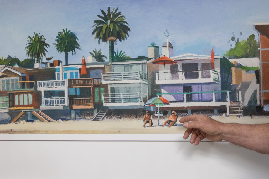 About two years ago, he was commissioned by a resident of the beach to commemorate a birthday with a painting. Once that work started, it got something much bigger underway: A year and a half of Pitcher painting on that one-mile stretch of sand from the Coral Casino to Fernald Point in Montecito ultimately produced 44 works, from which 20 are on exhibit.