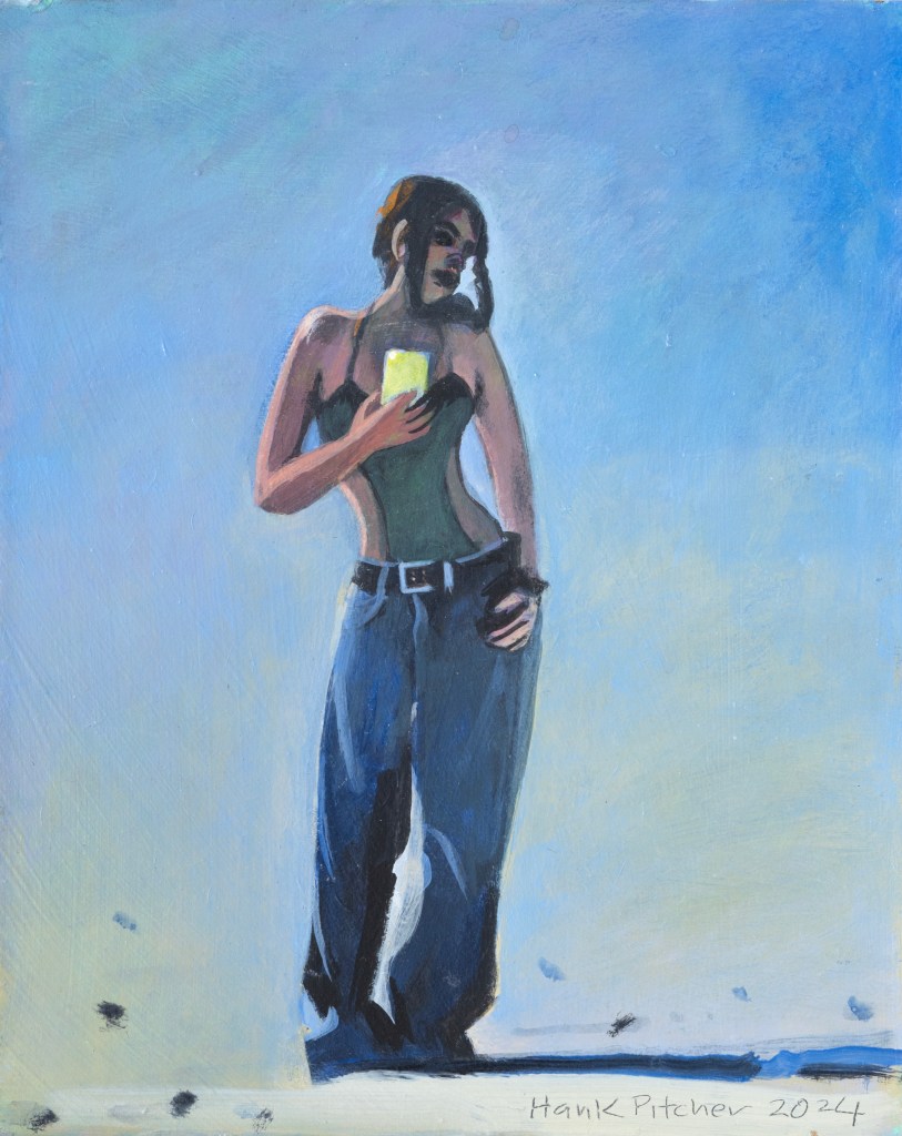 There’s a portrait of a young woman — “an influencer,” with her cell phone — recalling a very classical figure — a modern Venus. Another canvas depicts a man holding a beer while nearby, there’s a man with his cell phone. There’s a strong voyeuristic effect happening when taking in all the different small paintings together. It resembles Alfred Hitchcock’s Rear Window, where James Stewart observes the apartments across from him and he (and the audience) sees the pulsating rhythms of life. Clearly, these paintings are about memories, — yet they’re vivid. The past and the present are colliding in them, yet there’s no melancholia. They’re alive — and urgent. “When I’m at Miramar Beach, I’m dealing with the present, but I’m also dealing with the past,” Pitcher tells me.