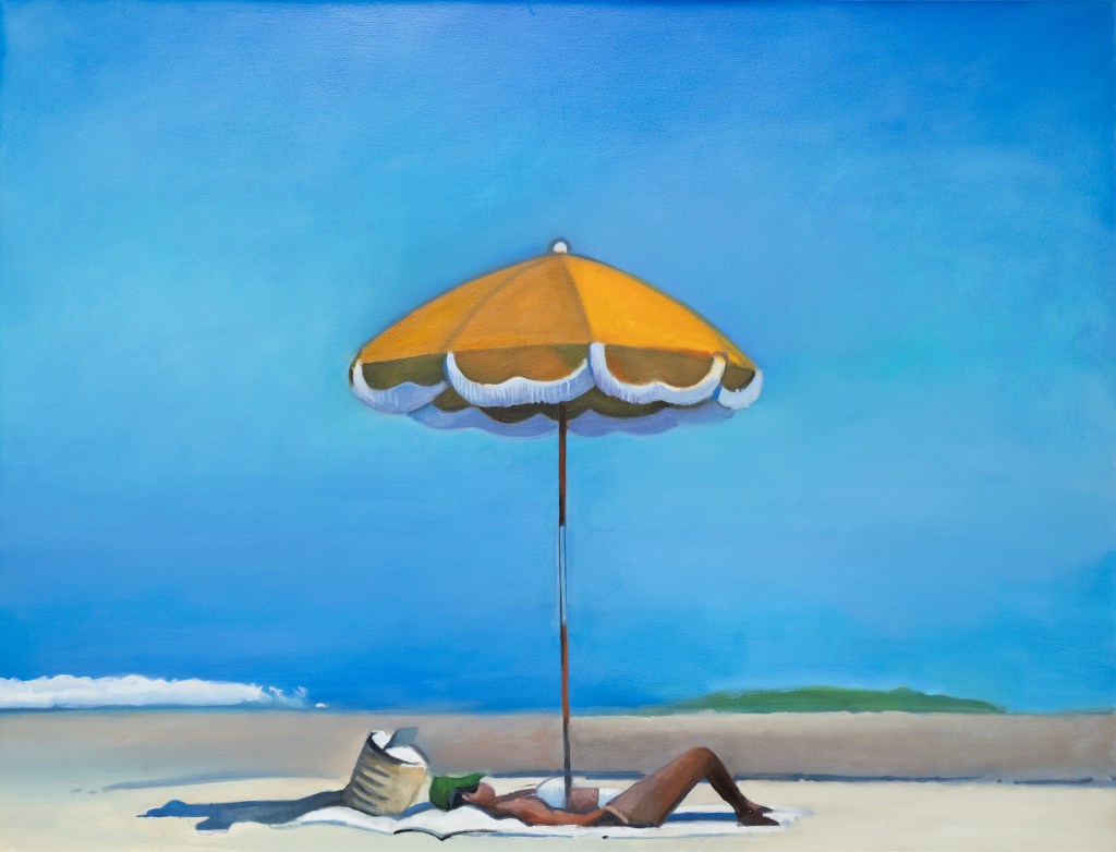 There are several prominent works in this show. “Yellow Umbrella” is the one that beckons you from the start. A lone woman is lying on the beach with a big yellow umbrella sheltering her against a dramatic blue sky. When I first saw it, I couldn’t help but think of the Joni Mitchell tune from “Big Yellow Taxi”: “Don’t it always seem to go that you don’t know what you’ve got ’til it’s gone.”