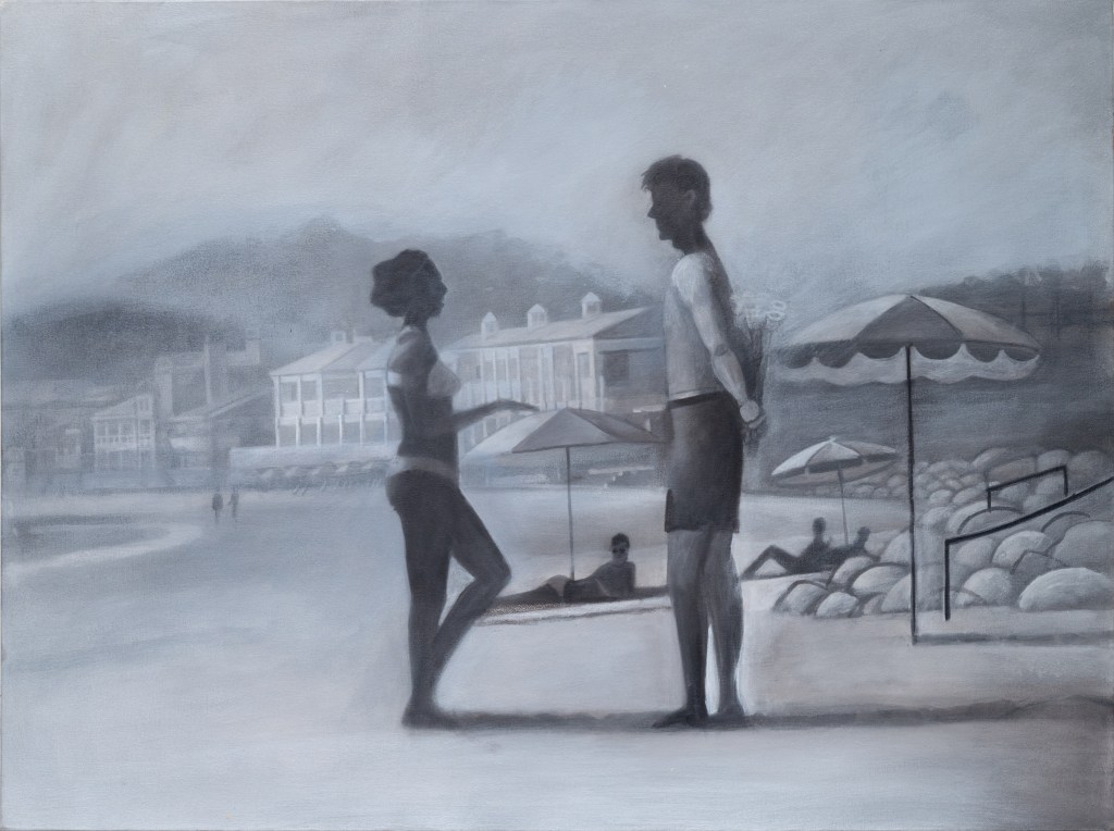 And yes, the backgrounds are rich — atmospheric — and the interplay with the bodies is fascinating. It’s worth noting how the characters’ faces and bodies are dramatically in half-shadows, albeit in broad daylight. In most beaches, people are enveloped either in shadows or in full light. At Miramar, light is always romantically perpendicular. And in the background, there’s the ocean, the sky, and the architecture of cottages or the Rosewood Miramar Beach. The latter, when depicted, is blurry.