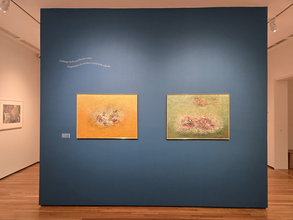 In the smaller side gallery, the deep-sea fantasy zone continues, with poetic texts illustrating in verbal imagery the artistic statements. One wavy text on the wall reads “Icebergs melt and floods come. Fragments of a broken world would drift ashore,” adjacent to a pair of oil and mixed-media pieces under the moniker “Adrift.” In these, embedded in a watery background, are clumped masses of abstracted data and found-object flotsam — a watch, beads, cat buttons, a chaotic but amiable mesh.