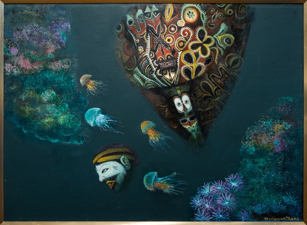 In the painting “They Wandered Sea Roads,” jellyfish maneuver freely in this enigmatic world, alongside a deity’s unattached head and an ornamental, shrine-like object cast into the depths.
