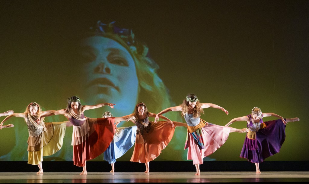The program began with an exploration of the Maenads, female followers of Dionysus from Greek mythology, choreographed by Moseley and her students. The three movements of the piece were intended to express the qualities of strength, succor, and frenzy; what emerged, in my observation, was a lyrical quality that reminded me of the work of Isadora Duncan (1877-1927), pioneer of American contemporary dance. As Moseley explained, the softer, lyrical quality of the movements and music spoke to the dancers more than the warrior type, so the powerful sense of the Maenads, which was intended, came out a bit softer, as the dancers enjoyed feeling the flow of the movements and music. But that was the whole point of the show, and why the credit for this piece was listed as Delila Moseley in collaboration with the dancers. How beautiful!