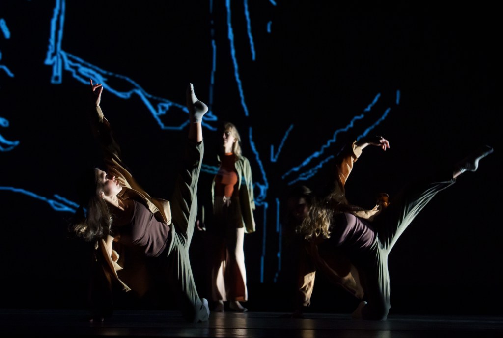 The penultimate piece, Luna, Luna, a duet danced en pointe, by Sarah Delima and Jenna Turner, explores the tensions expressed in the sarcastic poem “In Dispraise of the Moon,” by Mary Elizabeth Coleridge. As with all of Ventura’s works I’ve seen, she asks the audience to confront inherent biases and inconsistencies in contemporary western life. The Moon, usually thought of as female, portrayed as a pale derivative of the masculine Sun, is symbolic of the hegemonic representation of women throughout western history. Ventura wrote in the program notes, “At its core, the work is centered on how society compels women to view themselves and their creative potential as reflections of male brilliance, rather than sources of independent light.” As always, Ventura’s choice of music provides fascinating support for, and commentary on, the message of her choreography. For Luna, Luna, she chose a haunting synthesizer rendition of Debussy’s famous “Clair de Lune” by Isao Tomita.