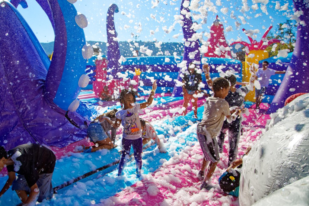 There is a diverse inventory of bouncy features, with the world’s largest bounce house being home to giant slides, ball pits, climbing towers, and basketball hoops. At the center of this dreamland is a custom-built stage where the resident DJ brings tunes to the bouncing arena. The DJ tailors music to fit the age groups of the various games and competitions.