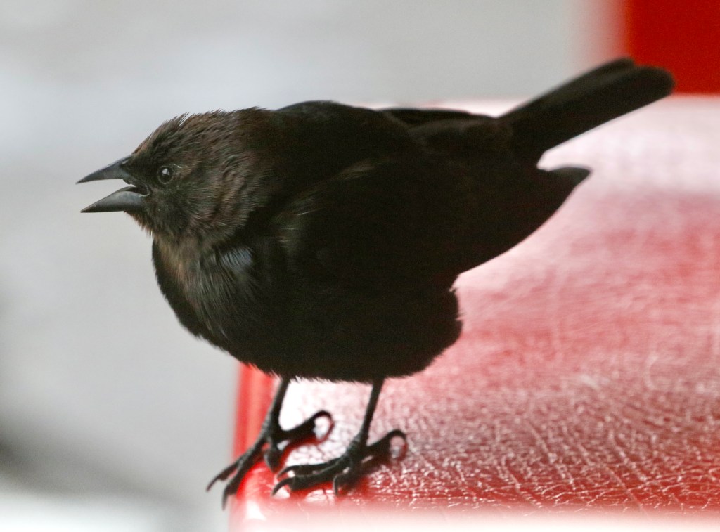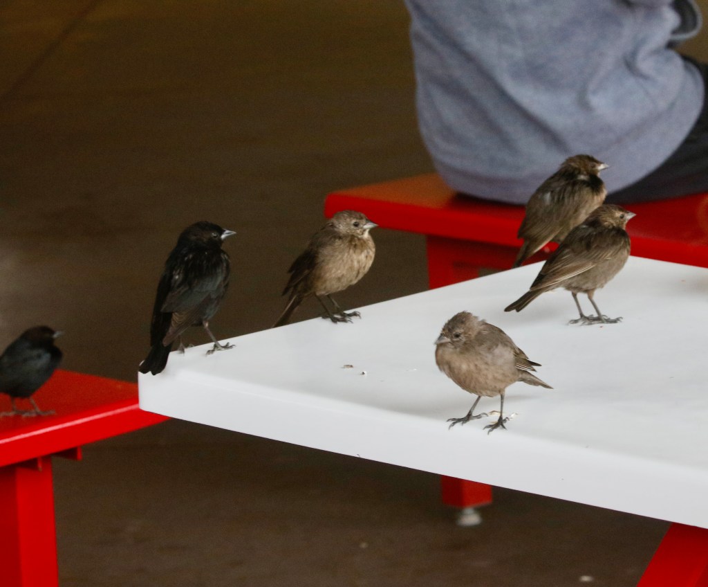 The male cowbird is black with a brown head, while the female is a pale brown, lightest on the underparts. They are smaller than other blackbirds. If you see a flock feeding on the ground together, a good field mark is that they hold their tails skyward. So where can you see a brown-headed cowbird? Take a field trip to Costco and hang around the food court. There you will invariably find a flock of cowbirds, mingling with the larger Brewer’s blackbirds, scarfing down any unattended food.
