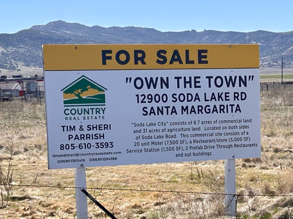 According to the sign, the property for sale — a k a the town — consists of 8.7 acres of commercial land and 31 acres of agricultural property, upon which sit the three buildings straddling the highway, plus two prefab drive-through restaurants. The whole kit and caboodle is listed at $1,950,000.