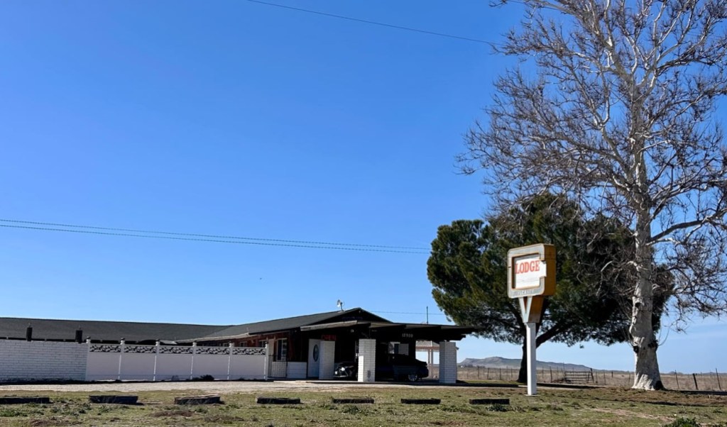 A motel sits on one side of the desolate road, with a shuttered gas station and restaurant across the street.