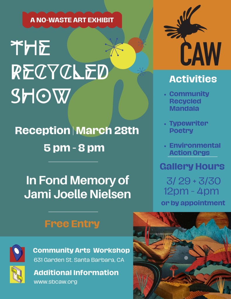 “Jami’s death earlier this year was a shock and a tragedy. I am so glad that friends of Jami and CAW volunteers are coming together to bring The Recycled Show forward in her honor,” said Santa Barbara Arts Collaborative Executive Director Casey Caldwell in a statement. “It helps me know that while Jami may have passed away from us, her love and her passion carry on.”