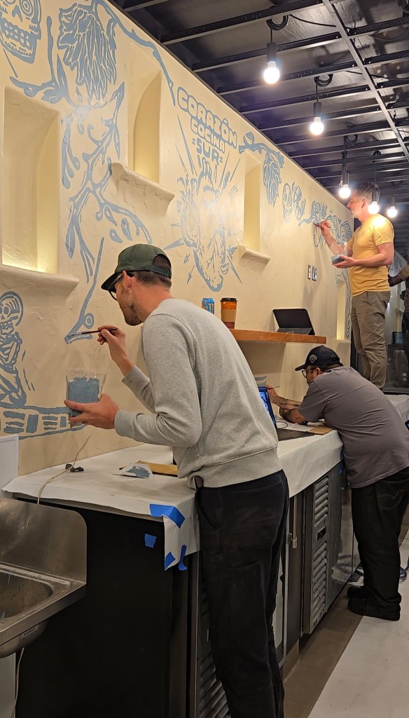 This week, Crawshaw and a three-person team from Foundation Press completed the bar back mural at Linden Square, a piece packed with Carpinteria lore, easter eggs, and nods to the deep Mexican roots that define Chef Vasquez’s menus.
