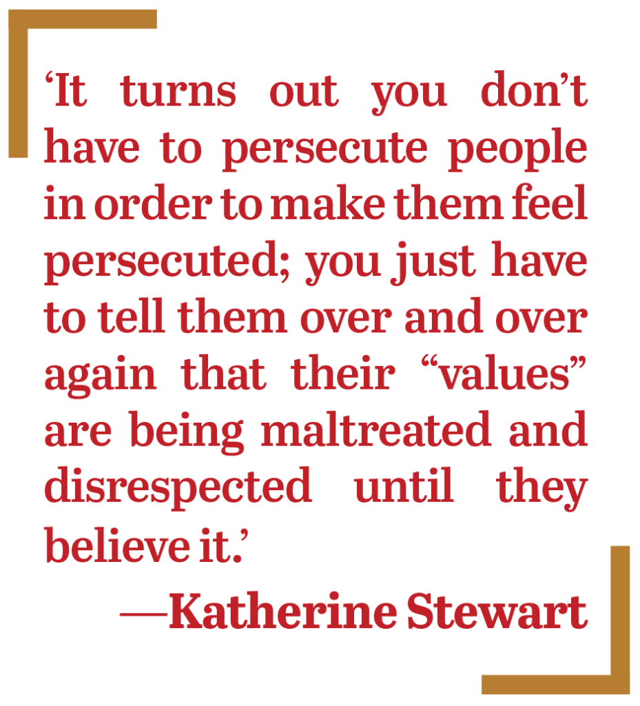 It turns out you don’t have to persecute people in order to make them feel persecuted; you just have to tell them over and over again that their “values” are being maltreated and disrespected until they believe it.