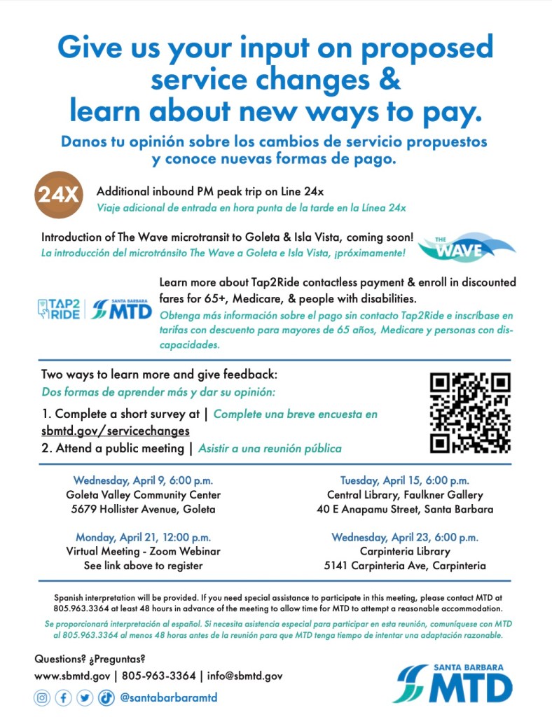 SANTA BARBARA – El Santa Bárbara MTD está organizando una serie de reuniones de divulgación pública este abril y está invitando al público a realizar una breve encuesta para dar su opinión sobre los cambios de servicio propuestos para el servicio de autobús local. Estas reuniones se llevan a cabo anualmente en la primavera para recibir aportes sobre los cambios propuestos que entrarían en vigencia el 18 de agosto de 2025.