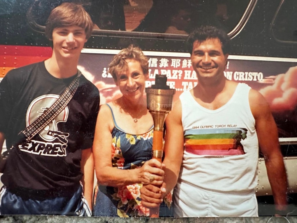 Helga Carden (center) with the torch at the Los Angeles Summer Olympics in 1984. | Credit: Courtesy