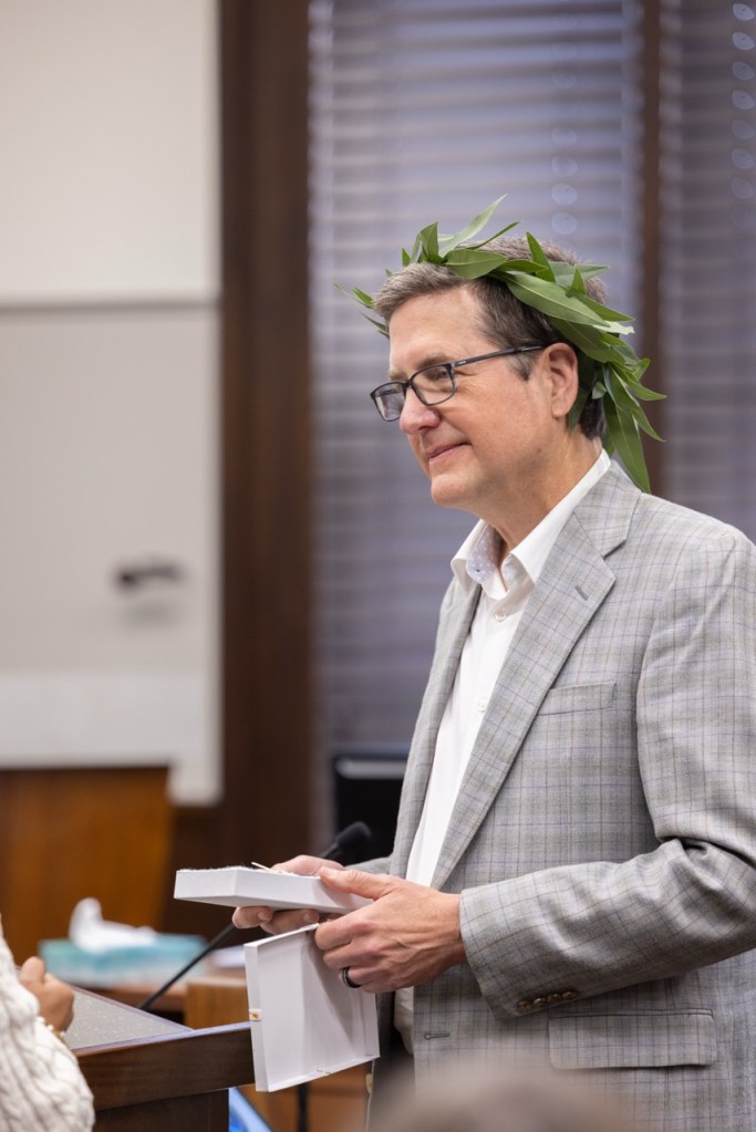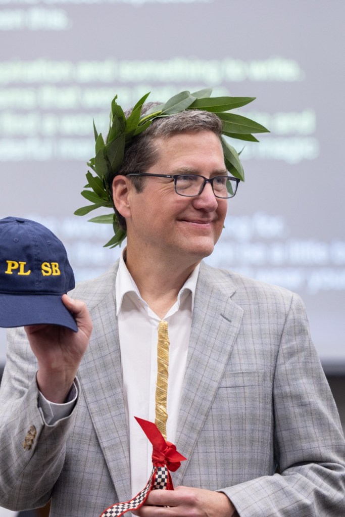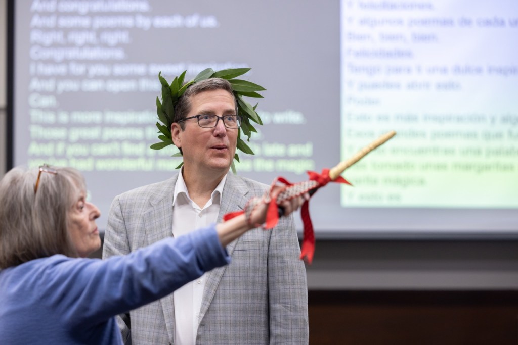 As has become a beloved tradition, the Poets Laureate welcomed Yatchisin in the council chamber with an array of whimsical gifts, including a crown of laurel, handmade by Willis’s wife, and a special magic wand from Bosselaar designed to wave, “If you can’t find the words, it will give you the word you’re looking for.”