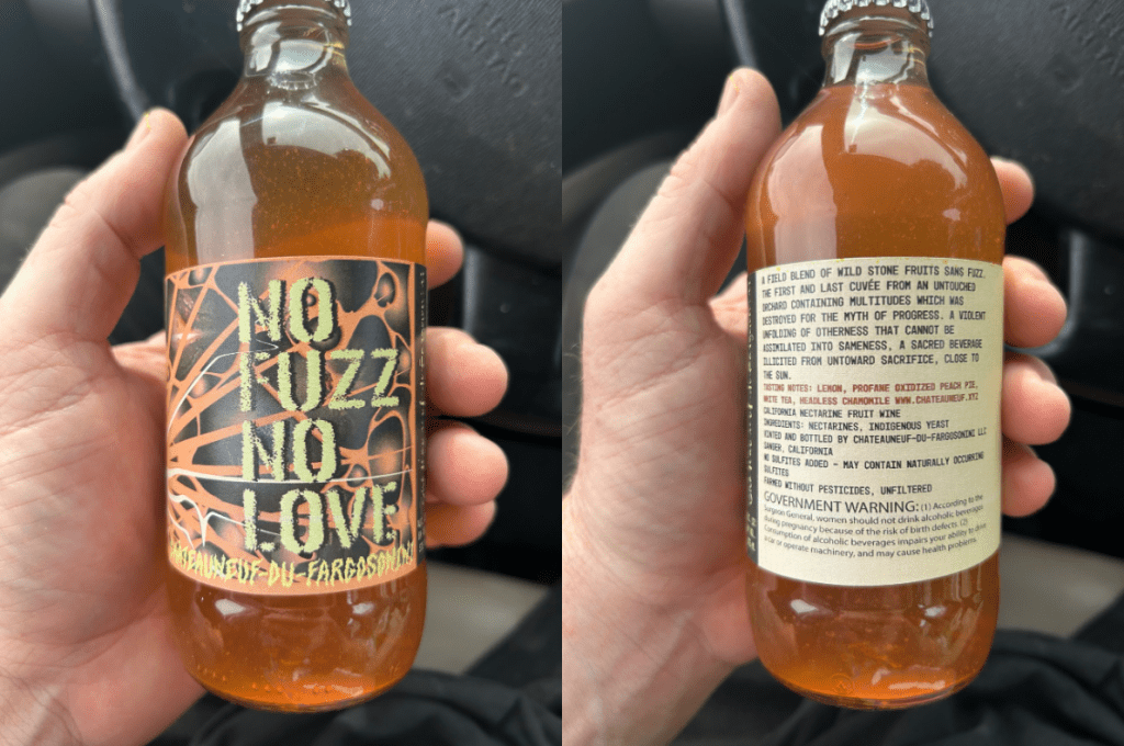 No Fuzz No Love: A 100 percent nectarine wine that is plush, tropical, and has a background of mild oxidation.