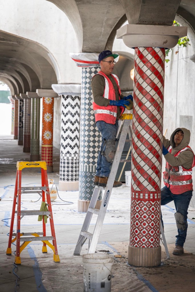 The first thing you notice as you head under the highway are the deep purple guardrails Shelton designed and his brother, David, fabricated. Sprinkled with cutouts shaped like toyon-flowers — a favorite of Shelton’s — they descend and drape in such a way that that solid iron feels soft and inviting. As you head farther in, you see the lines of columns, once beige and grimy, now wrapped in kaleidoscopes of bright tilework. Each one is unique and each could stand alone as studies in color and pattern, yet they seamlessly coalesce into a vivid visual tapestry that turns the public right-of-way into a legitimate sensory experience.