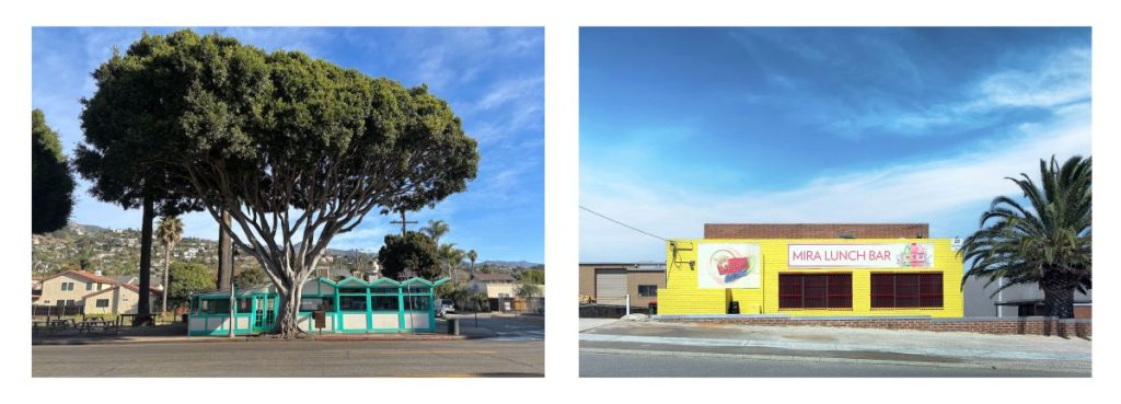 And formal echoes inform the pairing of Goleta’s Del Valle Grill and the unabashedly gaudy Checkers Lunch Bar, which takes its design cues from billboard art and louder-is-better aesthetics, rather than the subtle approach to restaurant design. Clarke’s image includes a footnote appearance by a massage parlor next door, while Dicks’s two-structure composition finds a space for rent next to Checkers, a hollow next-door resonance contrasting the in-your-face lunch bar facade.