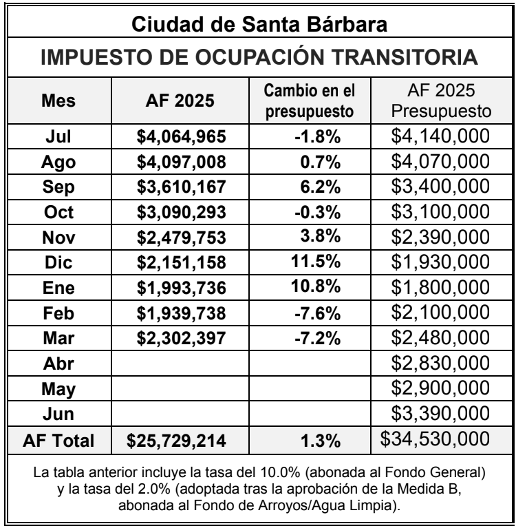La ciudad de Santa Bárbara recaudó $2.3 millones en Impuestos de Ocupación Transitoria (TOT) durante marzo de 2025, el noveno mes del año fiscal de la ciudad.