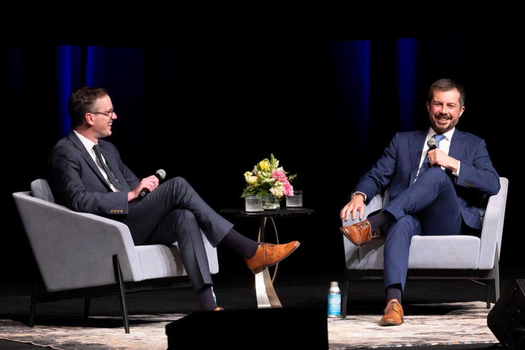 Jumping relatively quickly into the heart of his presentation after a few gracious thank-yous to the university, A&L team, and primary sponsor of the evening Sara Miller McCune, Buttigieg said, “I am not here to give a partisan commentary, but I am here to talk about where we are and where we’re headed.”