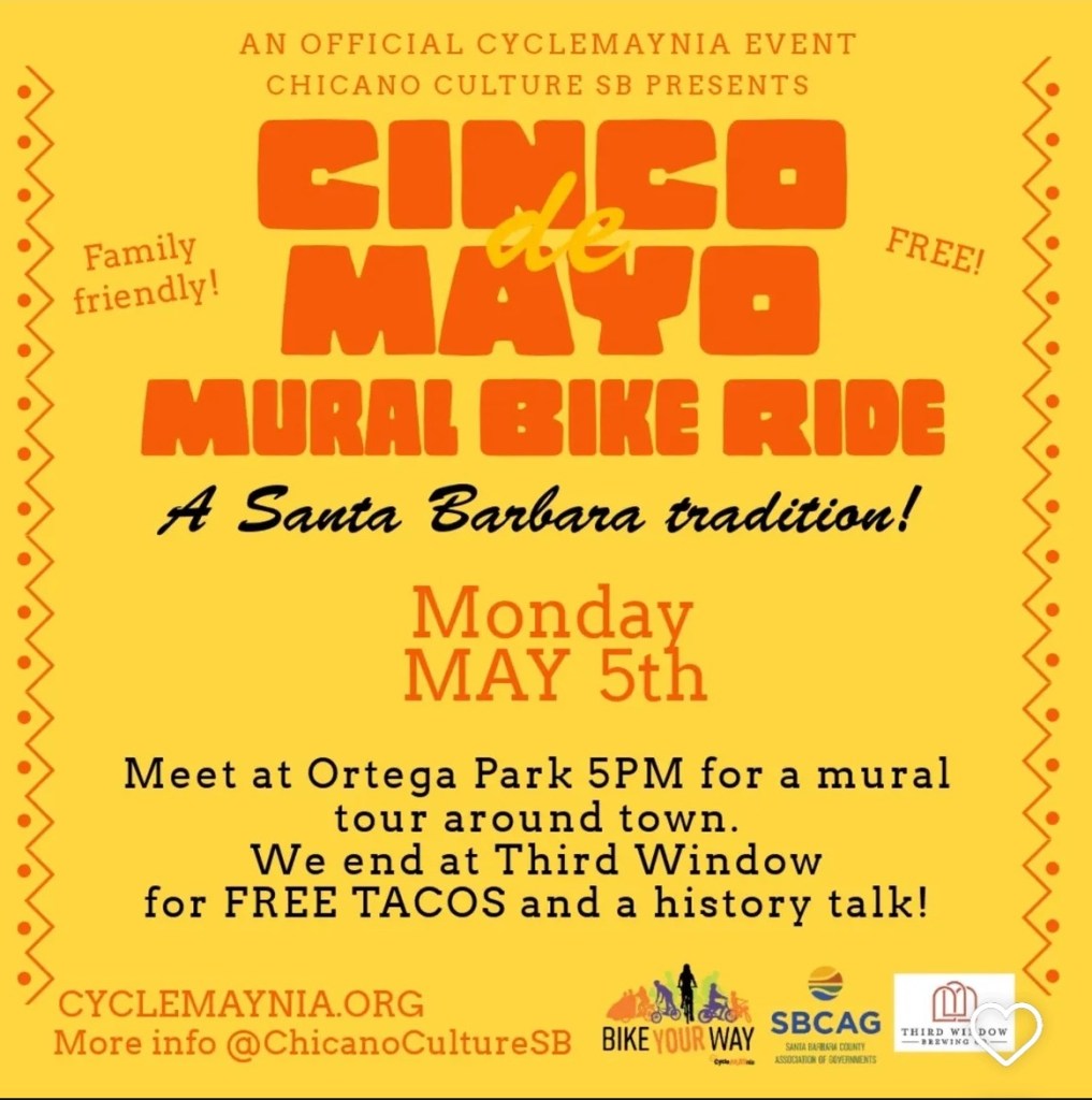 He began doing the group rides each year, sharing his love for Santa Barbara culture and its artists like Manuel Unzueta, a pioneer in muralism who is often considered the godfather of public art on the South Coast. Montenegro said that this year’s Cinco de Mayo Mural Bike Ride will be a “free, family-friendly” event “full of color, culture, and community.” The ride will travel around the downtown area and will finish with free tacos at Third Window Brewing Company.