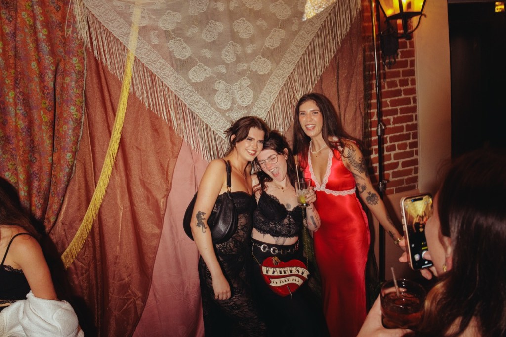 While cooling off before the next band took the stage, the audience snapped pictures in the photobooth, striking has-been duckfaces, swapping hugs and cheeky kisses — moments they’d later sneak into their wallets. It felt like a red-carpet event with a vintage touch: photographers captured memories against a cozy backdrop of quilts and throws. For those thinking ahead to future events — or just feeling the urge for a mid-party transformation — there were two pop-ups of My Damn Closet, featuring satin dresses from Europe tastefully curated by Joey Alexandria.