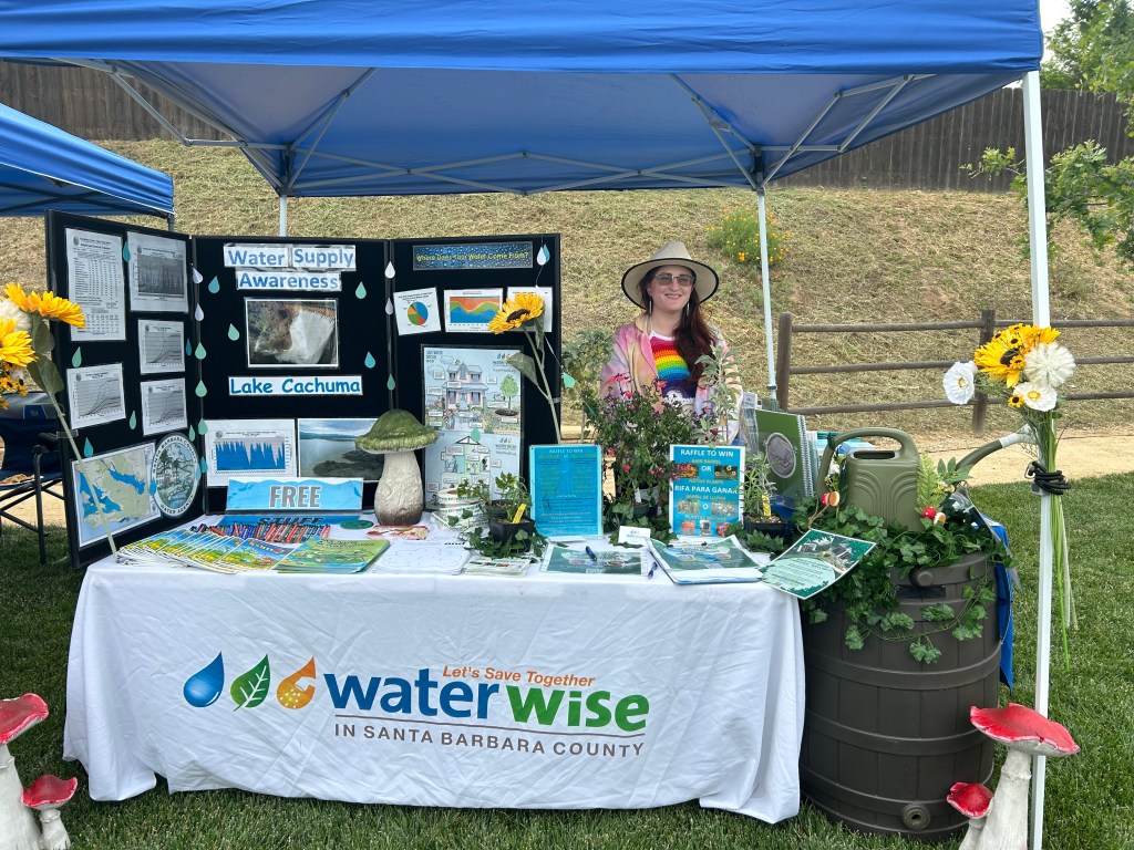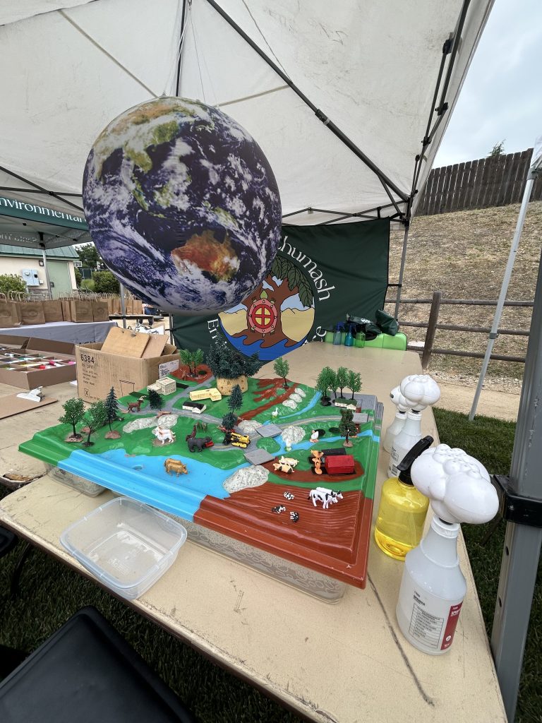 At the event, a giant Earth globe hung at the Santa Ynez Chumash Environmental Office’s table. Volunteers handed out goodie bags that included things like seeds, stickers, a T-shirt, and a reusable cup. A diorama of the area, complete with “rain clouds” (bottles with rain) demonstrated how stream runoff travels through the community.