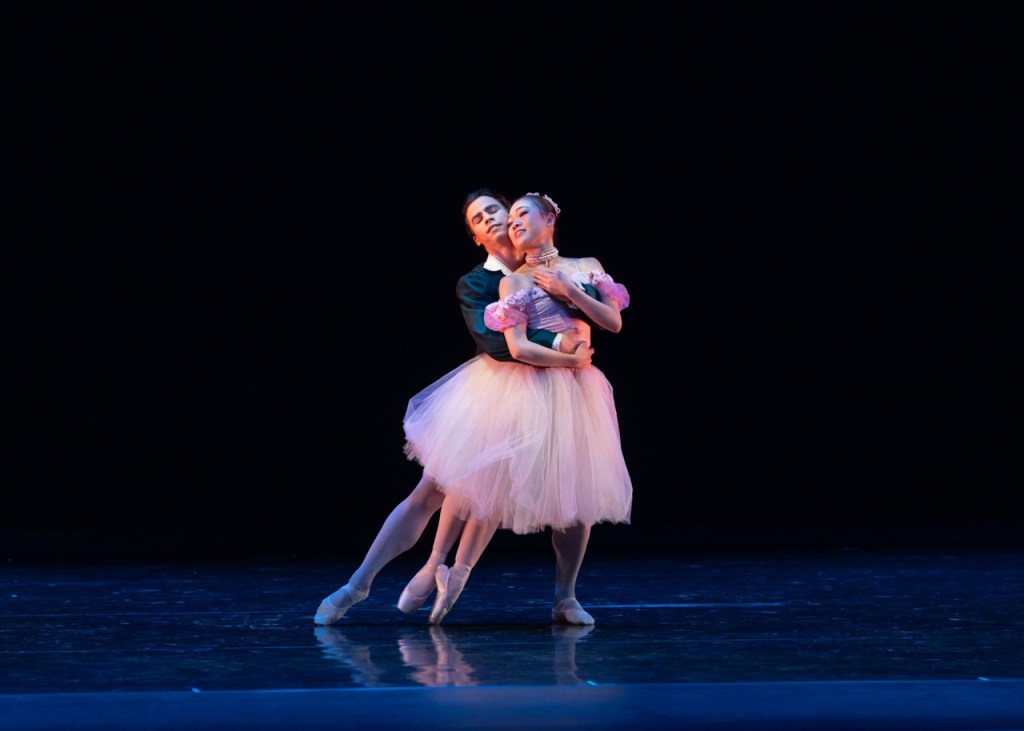 Beginning with a striking lighting effect from which the dancers emerged as if from behind a curtain of fog, Arpino’s choreography was danced to perfection by Brenna Chumacero, Amara Galloway, Akari Kato, Aimee Le, Maria Rita Rapisarda, and Harold Mendez. The costumes, on loan from Fort Wayne Ballet, were stunning! The women each wore a different pastel-colored romantic tutu, with glittering rhinestones in their hair, while Mendez wore a rich, dark green velvet jacket (and tights, of course). Very classy!