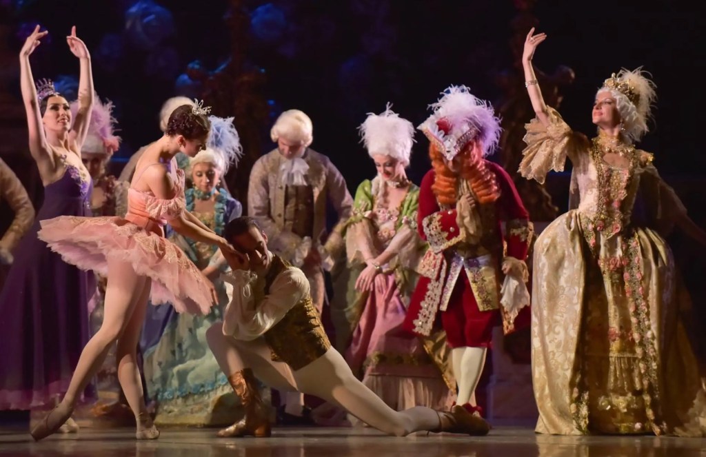 In the second act, the anticipated prince seems to see Aurora in a dream. He finds her, cutting his way through the forest, awakens her with the prophesied kiss, and the rest of the palace entourage simultaneously awakens. Of course, a grand wedding ensues! At the wedding, some of the guests are other fairy tale characters: a blue bird and his lady, Puss ‘n Boots and his partner the White Cat, and Red Riding Hood and the Wolf. The prince and Aurora are married, and all is well in the realm.