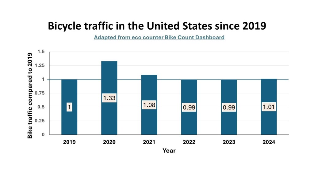 Even when “bicycle traffic” (all bicycles crossing automated counters) is considered, there has been little change in the United States. Eco-counter (the largest maker of automated bicycle counters) collects counts from hundreds of locations across the United States. Compared to the year before COVID (2019), the counts are effectively the same, suggesting that any decrease in the number of people who bike to work was approximately equaled by an increase in recreational cycling.