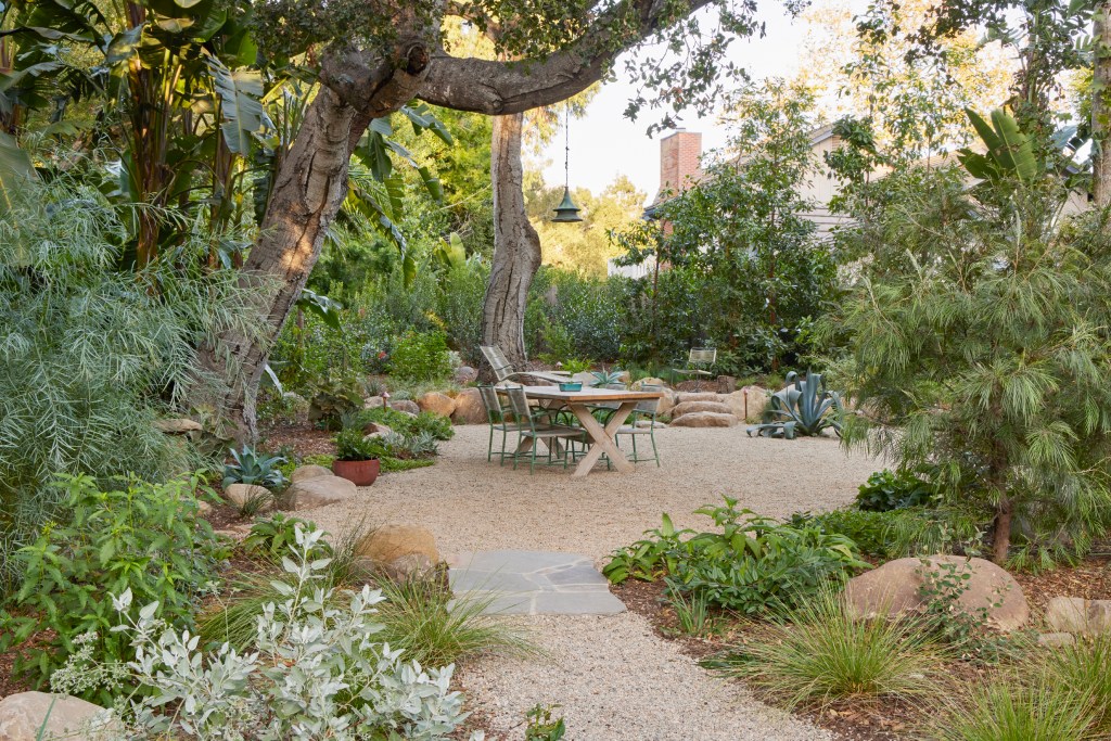 When CJM::LA started the transformation, the house was surrounded by a high wooden fence, completely shut off from the rest of the neighborhood. The fence was eliminated, and the front garden is now open and inviting. Miller shared that her clients were drawn to the property in part because of the mature oaks throughout the area. Indeed, huge oak trees in the front and back of the house seem to reach out to their neighbors nearby. Stone paths welcome visitors, gently moving them from one area to the next. Spaces are defined by shaped gravel punctuated with boulders and unique decorative elements.