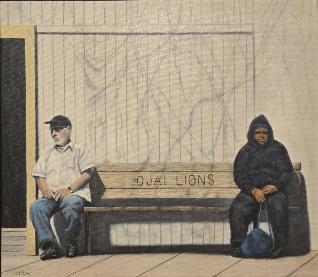 Although each year’s exhibition is unique by nature, continuity comes in various ways, through familiar artists making the cut. In an unusual case, we encounter a “déjà vu all over again” appearance of Bruce Berlow’s painting “The Ojai Lions,” also part of last year’s show, a warm-spirited depiction of two men perched on a bench marked by the double-meaning title.