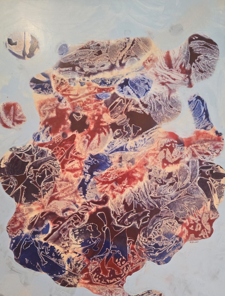 Abstraction finds its way into the entryway gallery, in the form of Sol Hill’s explosive accretion of speckles concentrically leading to a central vortex in “The Center Cannon Hold” and Marlene Struss’s “Speck in the Universe.” Struss deploys a different abstract tack, conjuring anatomical and/or astronomical blob-like forms floating in light blue space — psychological, cosmic, or both.