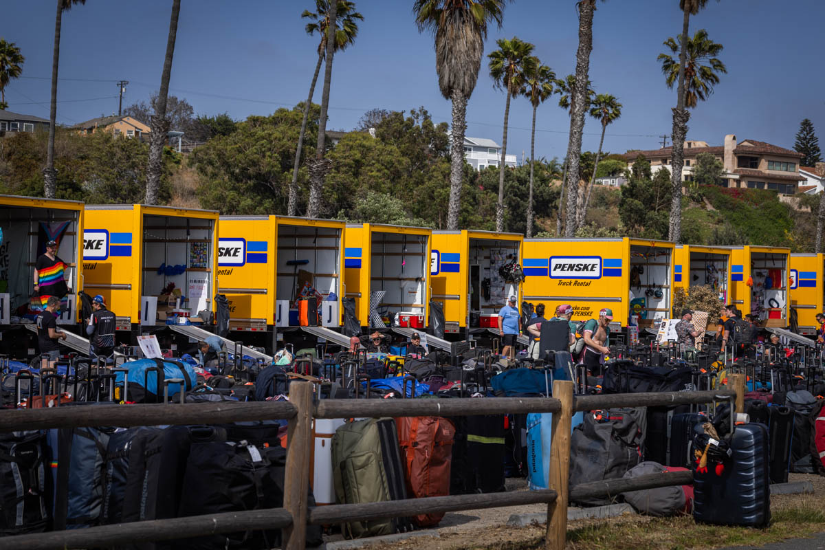 “It’s a big gay summer camp,” says roadie Katie Thomazin. The Seattleite has red star glitter stickers on her face as she waves in a tour bus of volunteers and supporters into San Buenaventura State Park for the last night of the seven-day ride.