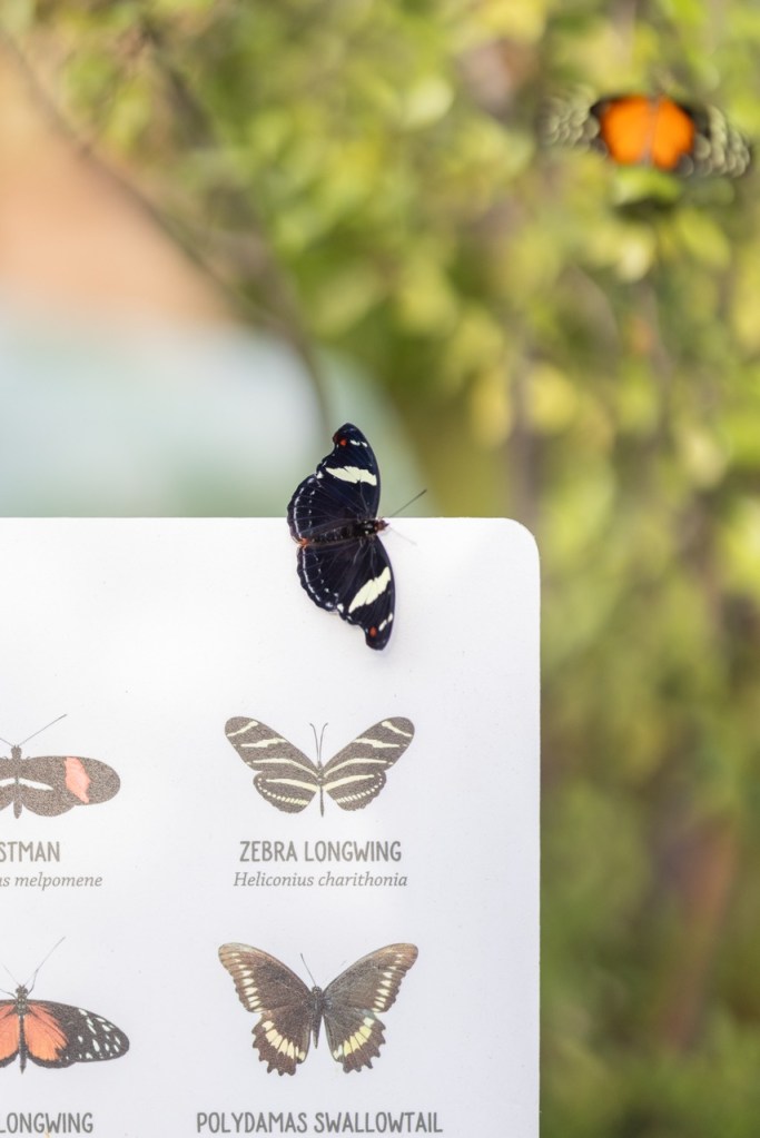 She added, “Some species need flowers to feed on nectar, while others need rotting fruit. Males suck up minerals from mud puddles, for use in reproduction. And most of them roost — or rest — in the trees and shrubs here.” Seeing these behaviors up close makes it easier to visualize how butterfly populations have been affected by habitat loss, pesticides, and climate change.