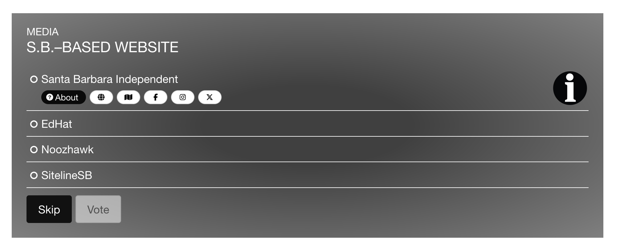 The voting round is multiple choice and the list is crafted by you, our readers. On the voting ballot, each category will have a list for you to choose from. Select your favorite then click ‘Vote’. If you don’t have a favorite to vote for in the category, you can click ‘Skip’.