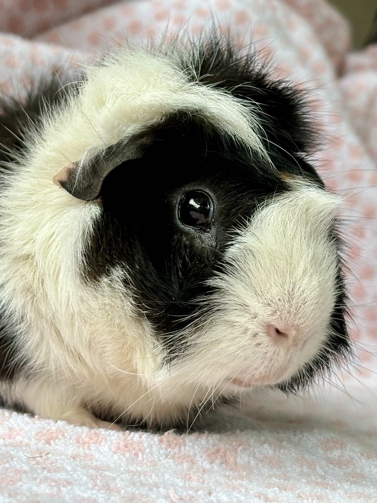 Here is a sweet male abyssinian guinea pig with a lush black and white swirly coat. He is quite gentle, interactive, and thoroughly enjoys cuddle time on a lap, especially if there are greens and some carrot for refreshment! Button is sociable and might make a good companion for another single male