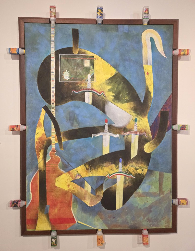 Socioecological concern undercoats Art Soto’s striking painting on a poofy white frame, “Dystopian landscape 1.” Its distorted and damaged seal-like subject clearly embodies the wages of global warming.